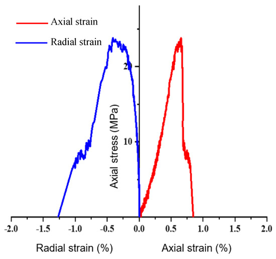 A triaxial compression experiment using the MTS815 rock mechanics testing system was carried out on the sandstone (#11-5) to obtain the complete stress–strain curve (Figure 2). The failure of the sandstone occurred when the axial strain reaches 0.5%. Based on the complete stress–strain curve, the uniaxial compressive strength, elastic modulus, and the Poisson’s ratio were 23.8 MPa, 4.4 GPa, and 0.12, respectively.