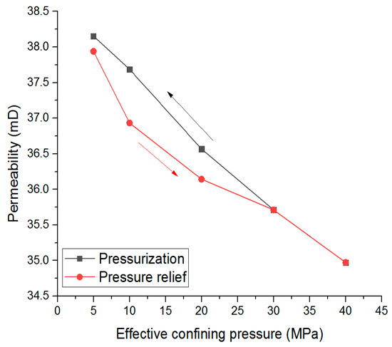 It can be seen from Figure 3 that the permeability of sandstone decreased with the increase in stress, which is in accordance with the general law of stress sensitivity on different rocks [36,37]. Without the stress condition, the sandstone permeability was measured at 65 mD, while the permeability decreased to 38.2 mD under the effective confining pressure of 5 MPa. When the effective confining pressure reached 40 MPa, the permeability decreased to 35 mD. The permeability of sandstone during the pressure relief process was slightly lower than that of the pressurization process (<1 mD) for the same effective confining pressure, with a maximum difference of about 2%.