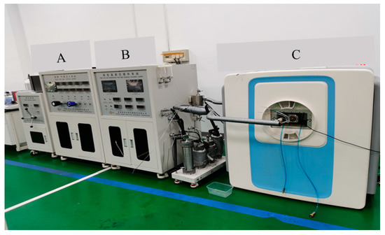 MicroMR12-110H-GS-HTHP NMR system with displacement and confining stress loading equipment (A—injection system, B—temperature and pressure control system, C—NMR system with the displacement device).