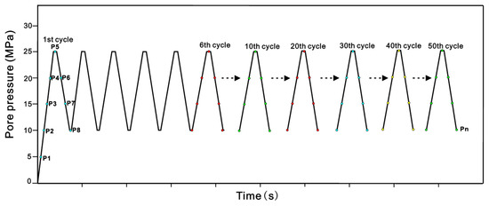 The nuclear magnetic data (T2 spectrum and NMR imaging) were recorded using the CPMG sequence at the specific points (e.g., at pore pressure of 10, 15, 20, and 25 MPa during the 1st, 6th, 10th, 20th, 30th, 40th, and 50th cycles of fluid injection and production) shown in Figure 5.