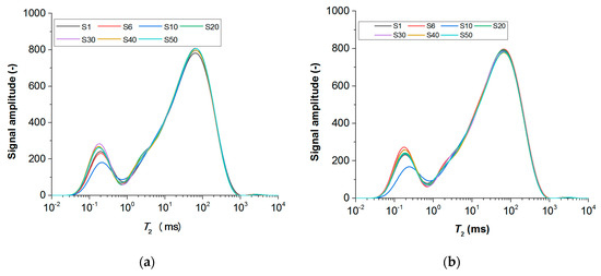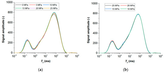Variation curve of transverse relaxation time (T2) during the first cycle of injection and production in sandstone ((a)—Pore pressure increase process; (b)—Pore pressure decrease process).