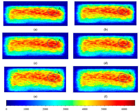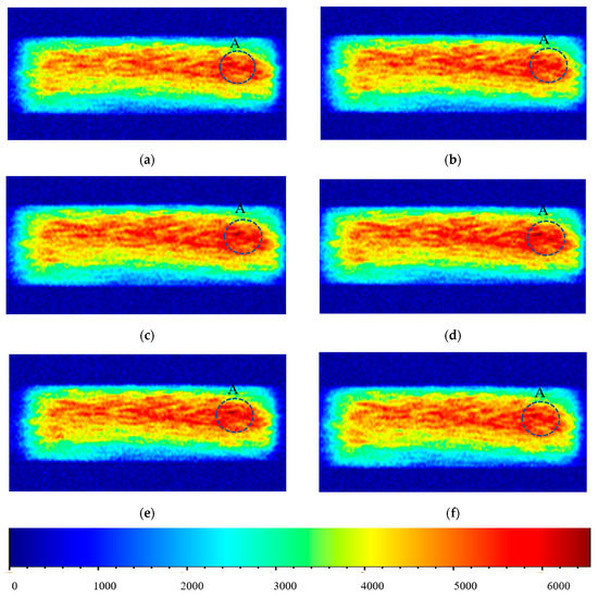 NMRI evolution of sandstone at the end of production after different cycles of fluid injection and production (A domain in the circle shows the obvious variation). (a) Cycle 1. (b) Cycle 10. (c) Cycle 20. (d) Cycle 30. (e) Cycle 40. (f) Cycle 50.