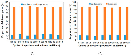 From the proportion of pores with two different sizes (i.e., medium and large) after different cycles of injection–production in the medium-grained sandstone specimen, it can be seen that macropores were the dominant type, accounting for more than 85%. The proportion of macropores increased by 2% after six cycles of fluid injection and production, but the overall variation was small (Figure 11a). After six cycles of fluid injection and production, the proportion of macropores increased by <3%, which is only 1% higher than that at the end of the fluid injection period (Figure 11b), implying that increasing the alteration cycles of the Shuang 6 gas storage may not lead to serious damage of the sandstone reservoir.