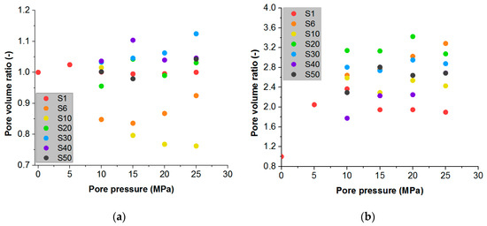 Here, we present the definition of the pore volume ratio (PVR) of the rock, which is the ratio of the NMR-based spectral peak area of rocks at a specific pore pressure and the number of alteration cycles to the spectral peak area of rocks at the in situ formation state. The decrease in PVR indicates that the rocks are subjected to compaction. That is to say, PVR > 1 indicates the increase in pore volume, implying structural and mechanical damage to rocks. During the fluid injection process, the correlation of the pore volume ratio and the pore pressure was weak for the medium pores, depending highly on the superimposed impact of alteration cycles (0.76 < PVR < 1.13). It should be noted that there was no linear relationship with the increase in the number of cycles. The volume of medium pores tended to increase after 30 alteration cycles of fluid injection and production. The variation interval of pore volume under the high pore pressure was larger than that under low pore pressure (Figure 12a). For macropores, 1< PVR < 1.05, indicating that the pore volume of macropores increased slightly after multiple cycles of fluid injection and production (Figure 12b).