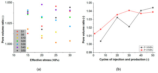 Variation in volume ratio of total pores with effective stress (a) and cycles of injection–production (b).