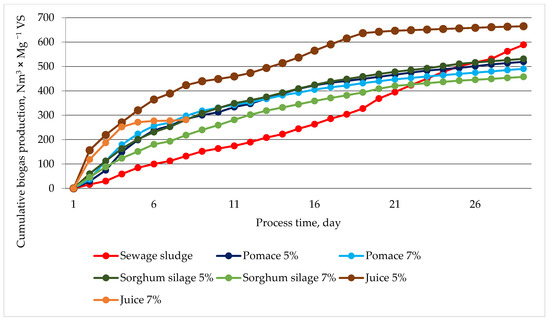 Moreover, the amount of methane as Nm3∙Mg−1 VS was determined (Figure 4). Most of the methane was obtained from juice (5%) (358.3 Nm3∙Mg−1 VS), and, for sorghum pomace and silage, the amount of methane was at a similar level: 213.4 and 216.7 Nm3∙Mg−1 VS, accordingly (Table 3). Other authors [37] reported a methane yield of 400 Nm3∙Mg−1 VS for sorghum. In other studies, the methane production from maize sorghum reached values from 232 to 387 Nm3∙Mg−1 VS [38], which is similar to the results obtained in this research. Maize silage is the most popular substrate used in agricultural biogas plants. According to research by Herrmann et al. [39], methane production from maize ranged from 319 to 376 Nm3∙Mg−1 VS.