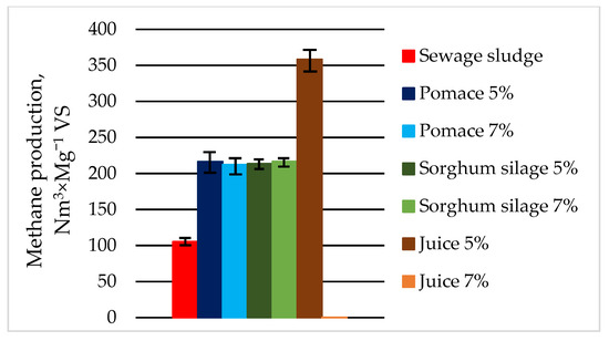 In terms of methane production (Figure 3), the highest average percentage of methane content was obtained for juice (5%) and silage (7%) (53.9 and 47.4%, respectively), and the lowest was obtained for sewage sludge (only 17.9%). In other studies on the anaerobic fermentation process from sorghum, the percentage methane yield was 64.4% from sorghum silage [35]. Whereas, only 12% of methane production was detected from sewage sludge [36]. Likewise, in another study [34], the fermentation of the liquid sewage sludge resulted in low methane content in biogas (from 5 to 18% only).
