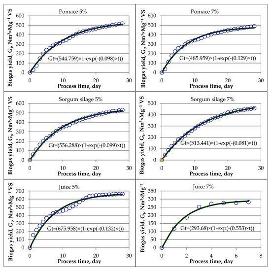where Gt is the cumulative volume of biogas at the end of the process, Nm3∙Mg−1 VS, G0 is a kinetic biogas production Nm3∙Mg−1 VS, k is a rate constant, 1∙day−1, and t is the duration of anaerobic digestion, day.