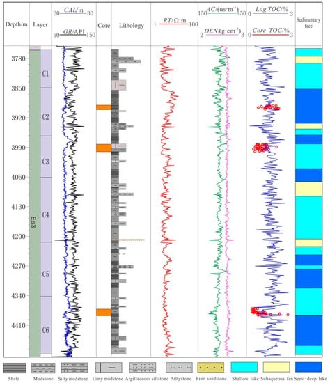 This study used logging data, core samples, geochemical data, and pyrolysis data of Well F39X1 on the Qibei Slope. The core from Well F39X1 is located in the upper section of Es3 and has a thickness of 40.1 m. It has three depth sections: 3890.87–3899.65 m (C2), 3982.57–3999.87 m (C3), and 4371.13–4386.23 m (C6) (Figure 2). The lithology is predominantly gray-dark to gray mud shale mixed with small amounts of siltstone and carbonate rock. The mud shale laminae and thin layers are relatively well developed, and the lithology frequently changes in the longitudinal direction. The organic carbon, pyrolysis, and mineral composition data were obtained from 115 samples in the three depth sections, basically covers all kinds of lithology, with an average depth interval of 0.35 m. Thirty-six samples were taken from different depths section for element analysis and thin sections analysis to identify lithofacies types and basic characteristic of Es3. Seven to ten samples containing different lithofacies types were used to performing electron microscopy, nitrogen adsorption analysis, high-pressure mercury porosimetry, and nuclear magnetic resonance analysis, and chloroform extraction was conducted using 19 samples with different lithofacies and TOC.