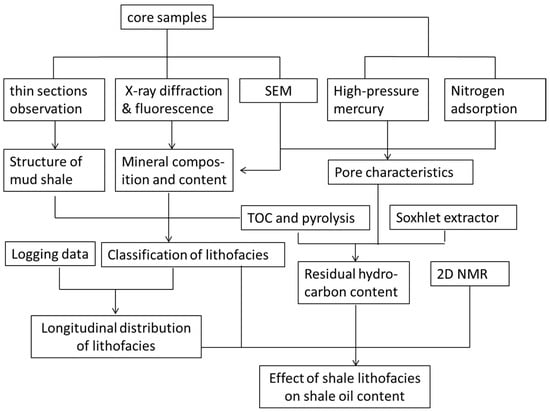 Polarized light microscope observations, X-ray fluorescence (XRF) analysis, XRD, and SEM were conducted to analyze the mineral composition and content of different lithofacies and the lamina structure of the mud shale. The pore types and pore structure characteristics of the shale were analyzed by high-pressure mercury porosimetry and nitrogen adsorption. A sulfur carbon analyzer, Soxhlet extractor, and rock-eval pyrolysis instrument were used to determine the geochemical indices and residual hydrocarbon content of the mud shale. Nuclear magnetic resonance technology has been used to analyze the characteristics of reservoir pore fluid, especially the content of the movable and irreducible fluid [27,28]. Two-dimensional nuclear magnetic resonance spectroscopy and fluorescence spectrum analysis of the shale particles were used to assess the residual oil content in different lithofacies and evaluate the shale’s oil-bearing potential (Figure 3).