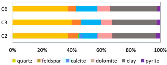 The XRD results show (Figure 4 and Figure 5) that the dominant minerals of the mud shale in the coring section are quartz, feldspar, clay, calcite, dolomite, and a small amount of pyrite. Felsic and clay minerals have the highest contents, with mass fractions of 25–43% and 20–40%, with average values of 38% and 30%, respectively. These are followed by calcite and dolomite, with mass fractions of 10–25% and 5–22%, with average values of 13% and 8%, respectively. The feldspar and pyrite contents are low, with average values of 6% and 2%, respectively. The mineral analysis shows (Figure 4) that the felsic content is generally high (mass fraction of 40–65%), followed by the carbonate content (15–50%). The SEM results show that the main component of the clay minerals is illite, accounting for 80%, followed by montmorillonite and chlorite, indicating that the diagenesis of the mud shales in Es3 has reached the middle diagenetic stage.