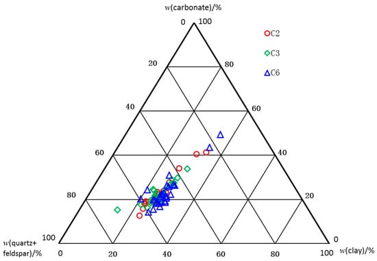 The mineral contents difference of the different lithofacies in the two coring sections is relatively low. The mass fractions are 40–45% for felsic material, 30% for clay, and 20% for carbonate, with small amounts of organic matter and pyrite. The main difference is the higher organic matter and pyrite contents in the upper section (mass fraction of two is 4–5%) and the lower contents of clay minerals (28–30%), while lower organic matter and pyrite in the lower section (2–3%), and higher clay mineral content is (29–32%). These results show a negligible change in the source material during the sedimentation period of Es3 in the upper section due to the large difference in water depth and sedimentary facies, affecting the spatial distribution of the lithofacies characteristics.