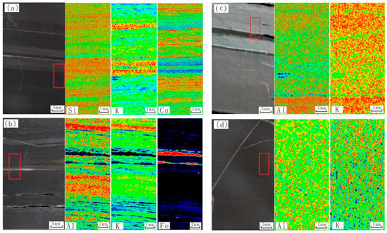 X-ray fluorescence (XRF) elements scan figure of different shale lithofacies in the upper Es3 member of Qibei slope. (a) Thin laminar shale, 3899.2 m, felsic, clayey, and calcareous lamina interbedding; (b) thin laminar shale, 3993.28 m, felsic, clayey and pyrite lamina interbedding; (c) thick laminar shale, 4377.2 m, the content of felsic in the upper bright lamina is high, the content of clay in the lower dark lamina is high; (d) massive mudstone, 3894.2 m, clayey and felsic are randomly distribute.