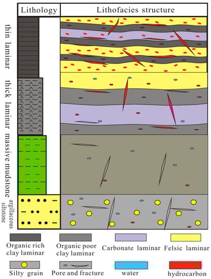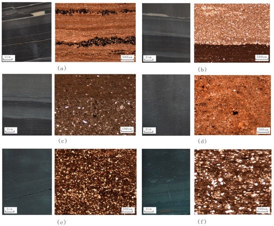 Unlike the United States marine formations, the continental shale formations in China are characterized by complex and diverse lithologies, short lateral distances, and high heterogeneity, including mud shale, siltstone, tuff, dolomite, and volcanic rocks, which are difficult to analyze [6,7]. Petrographic analysis is a critical component of assessing the complex lithology of continental shale oil [8,9]. Lithofacies refers to the rocks or rock associations formed in depositional environments, including the lithology, mineral composition, and sedimentary structure [10]. Continental mud shales have complex and heterogeneous lithology due to rapid changes in the depositional environment of the lake basin and source material. The petrographic characteristics substantially influence the shale’s organic matter type and abundance, pore space development, brittle mineral content, and oil enrichment degree [11,12,13]. Analyses of the Gulong shale oil in Songliao basin, Eastern China, have shown that the petrographic characteristics of the shale formation significantly affect the total contents of organic matter (TOC) and residual hydrocarbons. The organic carbon and free hydrocarbon contents are higher in the laminar and foliated shales, and the laminar layers provide storage space and seepage channels. In contrast, silty and dolomitic shales have low TOC, resulting in low free hydrocarbon contents; however, their brittleness and porosity are relatively high, making them suitable for fracturing [14,15,16]. Therefore, it is of great significance and innovation to carry out the analysis of lithofacies characteristics and classification of continental shale, and to clarify their effects on shale oil enrichment in order to reveal the distribution law and heterogeneity of shale oil, and to carry out the evaluation and prediction of shale oil desserts.
