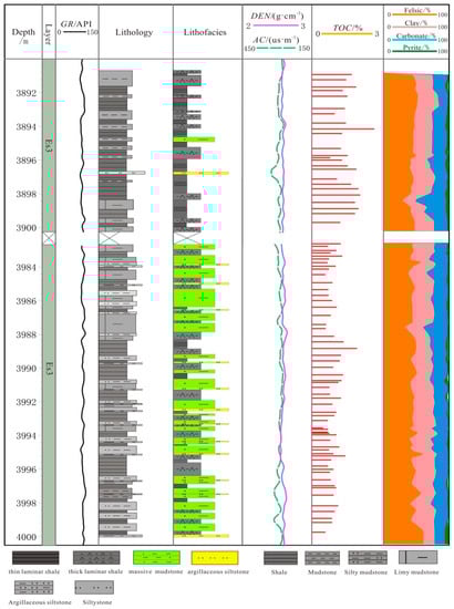 A comprehensive histogram is established based on the results of the lithological analysis, lithofacies classification, and mineral distribution (Figure 8). The shale lithology of Es3 is highly variable, including black shale, dark gray shale, gray mudstone, light-gray argillaceous siltstone, and yellow-gray dolomitic mudstone. These layers occur alternately in the vertical direction, indicating that the lake basin’s sedimentary environment and terrigenous material input changed significantly in this period. The 3891–3900 m section is primarily composed of thin black laminar shale and thick dark-grey laminar shale, accounting for 95% thickness of layer, with small amounts of massive mudstone and argillaceous siltstone. The TOC is high in this section, with mass fractions of 1.1–2.5% and an average of 1.5%. The lithofacies characteristics show that the water body of the lake basin was relatively deep, and there are semi-deep and some deep lake facies, with a relatively low input of terrigenous material. The lithology and lithofacies of the 3983–4000 m are also highly variable. The lithology is primarily composed of dark-grey mud shale, grey mudstone, yellow-grey dolomitic mudstone, and light-grey argillaceous interbedded siltstone. The lithofacies consist of thick laminar shale interbedded with massive mudstone, a small amount of laminar shale, and several thin laminar argillaceous siltstone lithofacies. Vertically, the lithofacies indicate a deepening of the water body toward the top. They are composed of a thin layer of argillaceous silt and massive mudstone or laminar shale. The layers become thinner toward the top, and the lamellar layer becomes more developed. The average thickness of a single layer exceeds 1 m. The mud shale in this section indicates a shallow lake environment and some areas of a semi-deep lake environment, with extensive source material input. The TOC is low (0.6–1.2%), with an average of 0.7%. The lithology, lithofacies, and organic matter content of the two coring sections differ, representing two different sedimentary environments and lithofacies development of Es3.