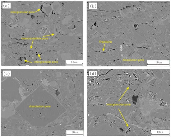 Shale pores have been categorized into organic pores, inorganic pores, and fractures. The inorganic pores can be divided into intergranular pores, intercrystalline pores, dissolution pores, and other pores. Zhao (2020) classified the mud shale in the Es3 in the Qikou Depression into matrix pores and fractures and further divided them into intergranular pores, intercrystalline pores, organism cavity pores, organic pores and bedding fractures, and structural (micro) fractures [18]. Following this example, we categorized the pores in the mud shale with different lithofacies based on the pore development type and characteristics (Figure 9). The SEM analysis shows that the pores in the felsic and calcareous laminae of the thin and thick laminar shale with a medium TOC are relatively well developed. There are many intergranular pores with a diameter of 0.5–2 um in diameter, some intercrystalline pores in the clay minerals, and dissolution pores in the calcareous minerals. There are no organic matter pores because of the low degree of organic matter evolution. In contrast, the pores in the thick laminar shale with low TOC and the massive mudstone are poorly developed. There are no intergranular pores, a few dissolution pores, and clay mineral intercrystalline pores. The reasons are as follows. First, the clay mineral content is low in the felsic and calcareous laminae, and the interparticle space is not completely filled with clay minerals. Second, the dissolution of some clay and calcareous minerals by organic acids generated during hydrocarbon generation in the laminar shale with a higher TOC promoted the development of intergranular and solution pores.