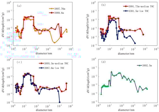 Pore distribution of different shale lithofacies of Es3. (a) Thin laminar shale; (b) thick laminar shale; (c) massive mudstone; (d) argillaceous siltstone.