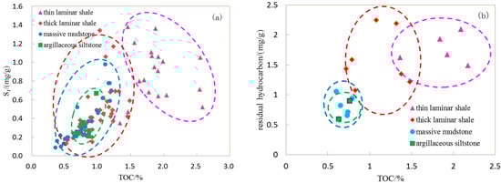 From the Figure 11, it is clear that the shale oil content is mainly controlled by its TOC. Due to the differences in the TOC content, shales with different lithofacies have different shale oil content. If the laminar shale has a high TOC content, the shale oil content is also high. In contrast, the residual hydrocarbon content is generally low if the massive mud shale and argillaceous siltstone have low TOC contents. If pyrolysis and extraction methods cannot comprehensively evaluate shale oil content, some indirect methods such as two-dimensional nuclear magnetic resonance spectroscopy and particle fluorescence analysis [41,42,43] can be used to further analyze the main controlling factors of shale oil enrichment in different lithofacies.