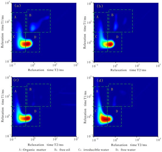 2D NMR shale oil content analysis of different shale lithofacies in Es3. (a) Thin laminar shale, 4381 m; (b) thick laminar shale, 3895.6 m; (c) massive mudstone 4373.35 m; (d) argillaceous siltstone, 3992.5 m.