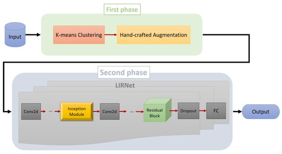 LIRNet is a neural network model. Its architecture and the core method, “two-phase deep learning classification”, are based on hierarchical classification concepts. We use a hierarchical classifier that maps input data into defined output categories. The classification happens first on a low level with highly specific pieces of input data. The classifications of the individual pieces of data are combined and classified on a higher level iteratively until an output is produced. Additionally, we separately run the first stage in two phases. The first phase involves using the K-means clustering algorithm to cluster similar classes for better accuracy. Subsequently, we use hand-crafted augmentation for data augmentation to reduce the dataset-imbalance problems by under-sampling and over-sampling the data. We use the unsupervised learning K-means method to modify supervised learning performance. The second stage is the training. We designed LIRNet to train the model. It is a lightweight convolutional neural network with an inception module and a residual block to enhance its performance. We added the inception module to level two of neural network and the residual block to the last layer of the neural network. The architecture is shown in Figure 1.