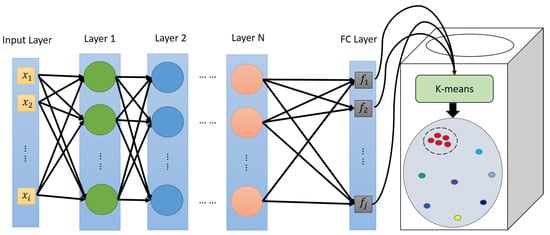 Figure 2. The architecture of K-means clustering. - Second phase—LIRNet: LIRNet is based on a lightweight convolutional neural network with an inception module and a residual block. It is hybrid method to enhance the neural network’s performance. The inception module in GoogLeNet was added to the neural network to allow multiple convolution kernels to extract information in different dimensions of the image together, and finally, perform fusion and an operation to obtain better image capture features. In the inception module, convolution kernels of different scales are used for feature extraction. The 1 × 1 convolution, 3 × 3 convolution, 5 × 5 convolution, and 3× convolution kernels are used to obtain features in different dimensions. The 1 × 1 convolution kernel can be used to reduce the amount of computation because after each channel passes through a 1 × 1 convolution kernel, its length and width do not change, but its depth will become 1. Therefore, the number of operations can be reduced when all cross-sections are multiplied and added to the values in the convolution kernel. The number of reductions is shown in Figure 3. The input images are W × H in size and 256 in depth. The filter size in the middle is 5 × 5 × 64. Therefore, the non-inception module’s convolutional computation requires 409,600 WH. When we use the inception module, the convolutional computation becomes 33,792 WH—less complex computation.