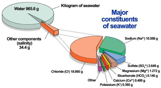 28] the constituent of 1 kg of salty water for an assigned salinity of 34.4 g/kg are graphically presented (see
