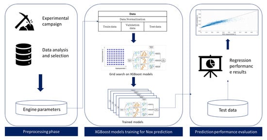 In the preprocessing phase, the engine data values acquired from the experimental campaigns were analyzed, handled and ’cleaned’. In the following steps, related to the XGBoost models training phase, the data were normalized and split into training, validation and test sets when necessary, and then employed to perform the learning process of several XGBoost architectures. The grid search algorithm was used as a powerful hyperparameters tuning technique to find the most accurate architecture for each specific case study. Given that the performance of an AI model is heavily dependent on the hyperparameter values, a combination of grid search and cross validation approaches [40] was used to identify the optimal values for a specific model. As with any machine learning model, the XGBoost was defined by a set of hyperparameters that had to be specified in order to tailor the model for the specific application. In the final step, the performance of the best XGBoost architecture was evaluated by considering a test dataset according to different metrics, i.e., and coefficient of determination .