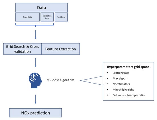 In the processing phase, all datasets employed over the different analysis were split into train, validation and test sets in order to ensure a reliable learning process for the models and to evaluate the prediction performance. This particular mathematical problem belongs to the class of supervised learning, due to the presence of desired output exploited in the learning process [43]. The logic for the developed ML model, together with the XGBoost architectures and the hyperparameters involved, are shown in Figure 3.