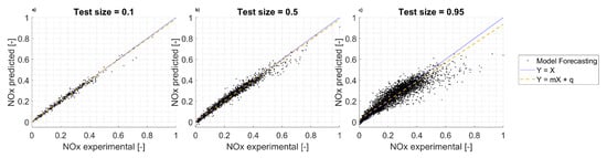 The considerable reduction in the engine points ascribed to the model learning phase, as the test dataset increased from 0.1 to 0.95, caused the prediction performance to decrease. When 95% of the data was used for the testing, significant errors were attained, despite the moderate increase in rmse as the split switched from 10% of test size (60.0 ppm) to 50% of test size (77.4 ppm). It is, in fact, worth underlining that the model prediction performance remained high, despite the halving of the training data set, thus, indicating a remarkable capacity to properly capture the physical phenomena. Additionally, the regression line in Figure 4 demonstrates the rise in noise brought on by the test size-appropriate sensitivity analysis.