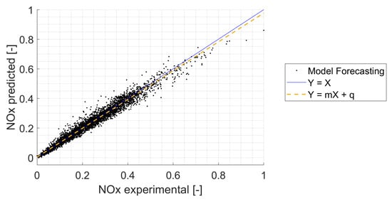 In terms of the robustness of the virtual sensor, the findings obtained in this example were consistent with those obtained in the previous cases, as can be observed. In addition, the Bench–ECU example demonstrates how the formation phenomenology of nitrogen oxides was accurately estimated ( of about 98%) by the developed virtual sensor which was tested on ECU engine data.