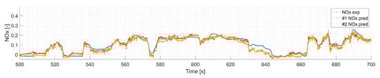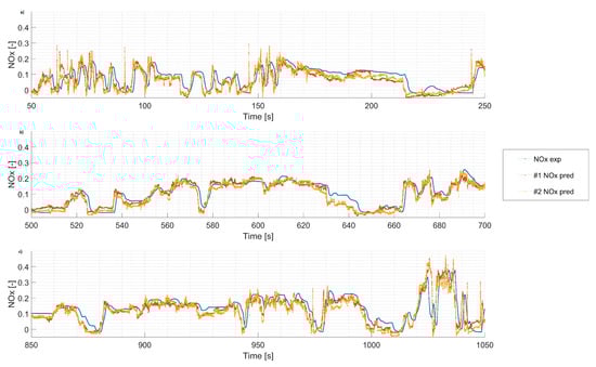 From the values of the metrics, a noticeable reduction in predictive performance, of up to 75% accuracy, and a major shift in the regression line could be observed (q was significantly higher than the stationary cases), as well as a large increment in the error. This was mostly due to the fact that the operating conditions encountered by the engine during a road driving mission are significantly different from those encountered during the model learning phase described by stationary conditions. The predicted NOx in both case studies are shown alongside the experimental traces in Figure 7, where three different time windows [50 s 250 s], [500 s 700 s], [850 s 1050 s] of the missions, with a length equal to 200 s, are highlighted. Three fairly large time windows that corresponded to different operating conditions are shown so that the forecasting ability of the model could be tested in almost all real-world conditions the vehicle would face.