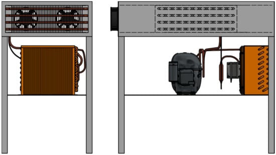 To validate the model presented above, tests were conducted on a real device. The heat pump was tested at two operating points: I, for the evaporating temperature of 1.0 °C, and II, for the evaporating temperature of 4.0 °C. The measurement stand is shown in Figure 2. The dehumidifier consists of a drying part (a duct made from insulated sheet metal and an evaporator with fans) and a technical part (aggregate and electrical installation). The Embraco NEU6217U on/off piston compressor was used for the test.