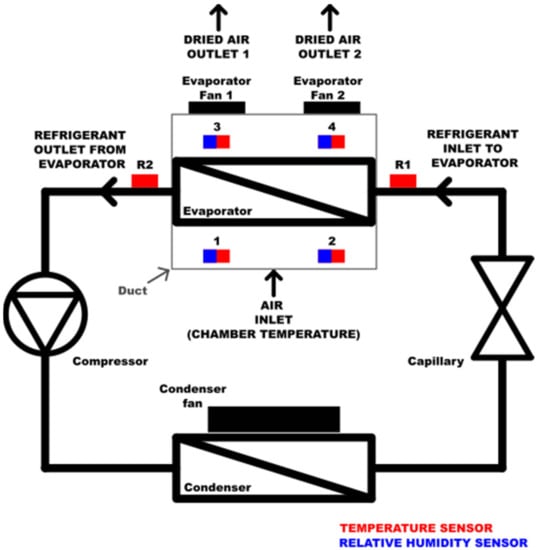 The drying process involves the removal of water from the material being dried. This is most often achieved by using hot and dry air. In the most commonly used drying devices, an electric heater is used to heat the external air, which in turn goes to the drying chamber, where water is evaporated from the material subjected to this process. The hot and humid air is then removed from the chamber, and another volume of the hot medium enters in its place. This system is called open-loop drying, which is characterised by low efficiency due to the loss of energy in the form of the waste heat contained in the hot air. The air circulation in a dehumidifier using a heat pump usually works as a closed system; the heated air on the condenser is directed to the drying chamber, and then it goes to the evaporator operating below the dew point temperature, where water vapour from the air condenses on its cold elements, the pipes and fins, intensifying the heat exchange process. The dehumidified air is directed back to the condenser, i.e., back to the starting point. Depending on the application, the heat pump can recover both latent and sensible heat from the working air, which has the potential for energy savings, especially for closed air circuits []. In addition, the dried air is capable of absorbing more water in the next cycle, which translates into the legitimacy of striving to obtain a drying medium of the highest possible temperature and low relative humidity. Due to the potential energy savings and the ability to control the parameters of the air at the outlet, the application of this technology in various industries has been described by researchers: agriculture [,,,], medicine [,], the chemical industry [], the textile industry [,,], the wood industry [,], and the paper industry []. Most scientists focus on researching innovation in the field of new drying methods and optimising the process and design to ensure lower energy consumption and improve overall efficiency []. In his work, Dean [] built an analytical model simulating the dehumidification process in which he stated that the consumption of electricity was primarily influenced by the temperature and relative humidity of the air. Rezk and Forsberg in their work [] analysed the process of designing an internal duct tumble dryer based on CFD software. They obtained a reduced pressure drop of up to 23% and an improved uniformity at the outflow boundary. The benefits of this approach include a more time effective design process and knowledge sharing with the CAD-engineer. Another publication [] examined the influence of air temperature and flow velocity on the efficiency of the entire system. The validity of using an inverter compressor with variable rotational speed on the moisture extraction coefficient was also analysed []. There are many publications dedicated to the design and optimisation of heat exchangers [,,,,,]; there is also a mathematical model for a complete set of exchangers (evaporator and condenser) [] in a finned air dryer. In a book, Zalewski and Niezgoda-Żelasko presented mathematical algorithms for calculating many types of single heat exchangers (i.e., finned heat exchangers) []. In article [], the authors proposed an algorithm for the evaporation of melted water from a finned evaporator, which flowed into a container placed on the top of the compressor. In a publication [], Zalewski presented a method of conducting thermal calculations of the surface area of a finned heat exchanger with known computational efficiency used for a ground heat pump. In another article [], the same author presented a mathematical algorithm for thermal and hydraulic calculations that can be used for finned evaporators with a fan forcing the flow operating at different ambient temperatures. In the book [], Shah and Sekulić reviewed the methodology of designing and calculating heat exchangers, presenting the basis of calculations for the ε-NTU method. The same relationships and calculation examples are also presented in one of the chapters of the publications [].