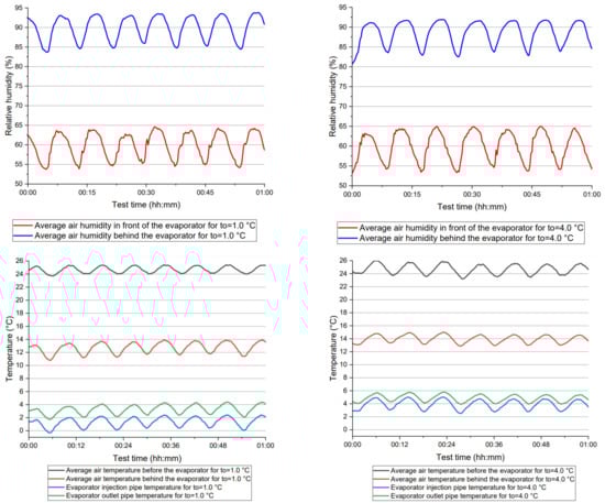 The temperature and humidity were measured at four points: two in front of the evaporator (1 and 2) and two behind (3 and 4). The location of the points was selected in such a way as to reflect the real airflow as much as possible and in a manner that was not affected by random factors. Pt 100 temperature probes (range −100 °C to 450 °C and accuracy of 0.15 ± 0.002) and EE210 relative humidity probes (range 0% to 100% and accuracy of 1.3%) were used during the test. The surface temperature of the pipes before (R1) and after (R2) the evaporator was measured as required by the mathematical model, i.e., complete evaporation, and the determination of specific points of the refrigeration system. The probes attached to the pipes were insulated with a layer of Armaflex (rubber coating insulation) to minimise the impact of external conditions on the sensors. In the duct in front of the evaporator, the airflow velocity was measured at nine points where the lines crossed: three horizontal and three verticals. The average measurement result was 1.51 m/s. Air flow velocity was measured with a MeasureMe MT891 anemometer (range 0.4 to 30 m/s) with an accuracy of ± 3%. The operating pressure of the heat pump was measured in the aggregate area condensing pressure behind the condenser and evaporating pressure through the compressor service port. Then, the medium saturation temperature corresponding to the measured pressures was read []. To compensate for the influence of external conditions, the sheet metal duct in which the heat exchanger was located was insulated with a 20 mm layer of XPS (extruded polystyrene). The measurements started when the required air conditions behind the exchanger and in the climatic chamber were met. The duration was set at sixty minutes. The results of the measurements are shown in Figure 4 below and in Table 4. The points before the evaporator (1 and 2) and after (3 and 4) were averaged. Condensate from the evaporator was collected inside the tank under the heat exchanger duct, and the amount of mass of condensate was measured. Electricity consumption was measured using a meter Lumel N27P with an accuracy of ±0.5%