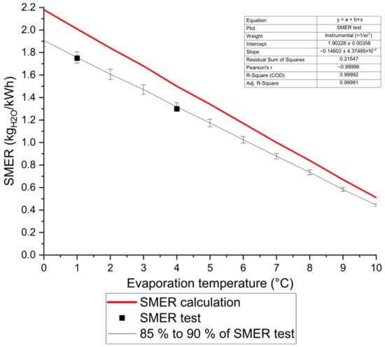 According to the calculations, the influence of the change in boiling point on the individual results was significant. The relative humidity at the outlet of the evaporator was practically unchanged, but it was defined as two variables depending on the mass of water vapour contained in the air and its temperature. The data provided by the manufacturer determined the electricity consumption of the compressor depending on the change in the evaporation temperature, which is also included in Table 7. Figure 5 presents a graph of the relationship between the boiling point and the calculated SMER coefficient, which takes into account the compressor’s electricity consumption plus the catalogue data of the fans and the controller. In addition, two points obtained during the described research are marked.