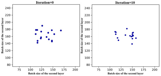 Optimizing the parameters in the PSO process is shown in Figure 13. By selecting the first two layers of the FCN for demonstration, the abscissa and ordinate are the values of the two layers of the FCN, respectively. In a total of 50 iterations, Figure 13 records the position of the parameters after every ten iterations. It shows how the parameters are optimized to the best position.