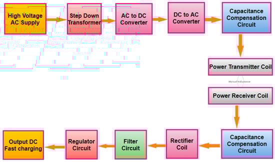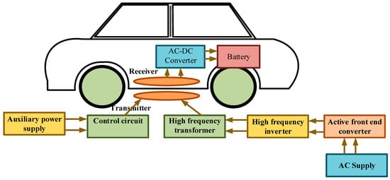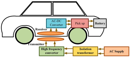 As the name suggests, the vehicle charges every time it is in static mode. The block representation of the static wireless charging technique is shown in Figure 7. Thus, it would be easy to park the EV within a particular spot or in storage that permitted interface with the WCS. The transmitter would be located underground, while the receiver would be set up in the automobile’s underside. Before getting out of the car to complete charging, the driver would align the transmitter and receiver [113,114,115,116,117,118,119,120]. The space between the edges of the transmitter and receiver, the scale of their pads, and the AC supply strength would all affect charging speed.