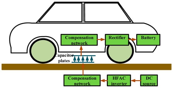 For medium- and low-power implementations, like spinning machines [78], portable electronics [79], and phone chargers [80], the CWPT framework technology’s cost-effectiveness and ease of use, utilizing improved mechanical configurations, as well as the geometric patterns of something like the coupling capacitors [76,77], are very advantageous. Inside the CWPT, coupling capacitors are employed to transmit power from the receiver to the source, rather than coils or magnets. Half-bridge converters receive their primary AC voltage via power quality control circuitry. The schematic of the capacitive wireless power transfer technique is presented in Figure 3.