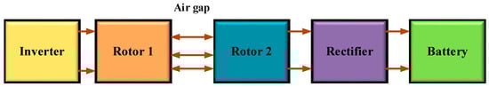 The armature winding and the synchronized permanent magnets make up the transmitter and receiver, respectively. Functioning at the transmitter side is comparable to motor operation [94,95,96,97,98,99,100]. The spinning of the transmitter magnet is caused by the mechanical tension induced on the transmitter winding when AC is applied to it. The receiver’s PM is torqued by the transmitter’s magnetic interaction shift, which makes the receiver magnet rotate synchronously with the transmitter magnet. The receiver now acts as a generator because the permanent magnetic field of the receiver has changed, converting mechanical power input into electrical output at the receiver winding. Permanent magnets connected by rotating gear are referred to as magnetic gear. Power converters rectify and filter the produced AC power at the receiver side before feeding it to the side of the battery.