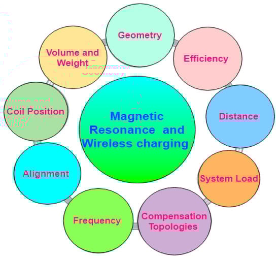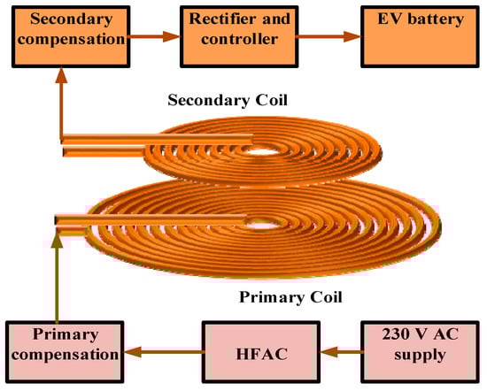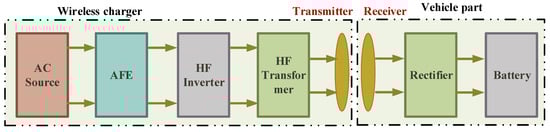 The wireless charging block diagram displays the conversion processes and their overall effectiveness. Each conversion step is designed such that you the end user is able acquire the most effective efficiency [122]. The efficiency depicted in the diagram is general. More than 95% efficiency has been attained, according to Qualcomm, Oak Ridge National Laboratory (ORNL), and others [123,124,125,126,127]. There are several phases in a wireless charging system, and each stage varies in complexity and efficiency. When converting PS from AC to DC, Active Front End (AFE) with Power Factor Correction is used. Power transmission from IPT calls for excessive-frequency AC to be successful. As a result, the DC–AC converter transforms low-frequency DC into high-frequency AC. A remote high-frequency transformer is placed between the converter and the primary coil in order to prevent primary winding isolation breakdown. The alternating magnetic discipline produced by this excessive-frequency AC follows Ampere’s equation. Due to the interplay of this magnetic discipline with the secondary coil, high-frequency AC is produced, in keeping with Faraday’s law. The secondary repayment community is utilized to evolve to resonant surroundings, improving performance. A compelling rectifier is then used to feed the battery to rectify the AC energy. The three crucial components of an EV wireless charging system are the compensation network, the power electronics converters, and the remote, loosely coupled primary and secondary coils, which are covered via ferrite.