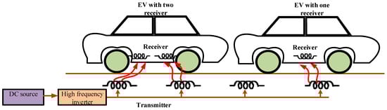 Today, the most efficient forms of wireless charging are resonant CPT [19,20,21,22], utilized in dedicated lanes for dynamic charging [23,24,25], and resonant IPT [26,27,28,29,30], used in both Static WC and Dynamic WC methods. In [19], a comparison of capacitive and inductive WPT was made. IPT has allowed for successfully marketed products at low power levels for many years [31,32]. Magnetic couplers—transformers with only a few millimeters between the propagation (transmitter (Tx)) and reception (receiver (Rx)) components—have been in various phases of development for some time [33]. Many researchers have used enhanced compensation strategies to increase efficiency [34,35,36,37], air gap, and power level [38,39,40,41,42]. WPT distances have been extended by MIT researchers, who published a study in 2007 detailing their success in lighting a 60-W bulb at a distance of 2 m, thereby building researchers’ confidence in expanding WPT to the necessary distances [43].