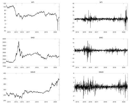 In this study, we focus on the measurement of the spillover effect of crude oil on the Chinese stock market and China’s gold market based on daily data. The Shanghai Composite Index and the gold futures index are used to represent Chinese stock market prices and gold market prices, respectively. West Texas Intermediate (WTI) oil prices are considered to calculate the global crude oil price. WTI crude oil prices are from the Energy Information Administration (EIA). We obtained 1357 observations from the daily dataset from 9 September 2013 to 22 June 2020. It should be noted that, we use time series data, which better reflects the macro situation [49,50,51] and is more suitable than panel data [52,53].