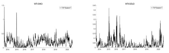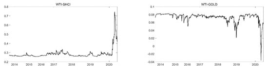The right part of Table 4 shows the estimated parameters of the time-varying copula models for six combinations of pairs comprising the series of the global crude oil return, China’s stock market, and gold market returns. The parameters and are the degree of persistence, and capture the adjustment in the dependence process, and and measures the dependence level. The time-varying copula model results are different from the static copula model results. On the one hand, most of the parameters obtained from the time-varying copula illustrate that China’s gold market (GOLD) is more dependent on crude oil prices than the Chinese stock market (SHCI), as shown by or . On the other hand, and values show a significantly different dependence on crude oil on the Chinese stock market and gold market. Overall, the results describe the difference in conditional dependence and the extent of variation.