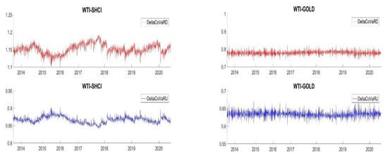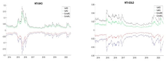 By using the marginal model and the best-fit copula, the downside CoVaR value of SHCI and GOLD at the confidence level of 95% ( = 0.05) are calculated under the condition of the VaR value of the WTI at the confidence level of 95% ( = 0.05). Then the values shown in Figure 3 and Figure 4 are quantified. The CoVaR values for China’s stock market and the gold market in the sample period vary with time. The downside CoVaR value is always smaller than the VaR value. From May 2015 to September 2015, the crude oil price fell sharply, and the decline in CoVaR in China’s stock market exceeded the decline in VaR. While China’s gold market shows the reaction in another period, from September 2014 to November 2014, and from March 2020 to June 2020. The collapse of crude oil prices may lead to a greater drop in China’s stock market and gold market, which is consistent with the conclusion of Meng et al. [57]. In addition, when a rapid rise happened in the crude oil price, the upside CoVaR value turns out to be bigger than the VaR value. Figure 4 shows that both the downside ∆CoVaR value of the Chinese stock market and the gold market are greater than the upward ∆CoVaR value. Therefore, it can be explained that the fluctuation in crude oil prices affects the upward and downward conditions of China’s stock market and the gold market. In addition, this effect differs in the upward and downward stages. This conclusion is verified by the statistical description in Table 6.
