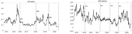 To further analyze how to use the portfolio to reduce downturn risk from crude oil, we first analyze their dynamic conditional correlation. Figure 5 shows that the dynamic corrections fluctuate during our data period. And we can divide the conditional correlation of WTI and SHCI into four subperiods. This shows that, from September 2013 to December 2015, China’s stock market shows a high correlation with the global crude oil market. Hence, the policymaker should be aware of the outside risks from the crude oil market to maintain the stability of China’s stock market. Conversely, from January 2016 to November 2017, the correlation between China’s stock market and the crude oil market is at a low level and low fluctuation. After December 2017, the correlation is still below 0.3. However, the fluctuation is more enlarged. Before January 2015, it shows a high level of up to 0.07 and high frequency. From February 2015 to April 2017, the correlation falls to an average level of 0.03. the correlation fluctuation keeps steady for one year after April 2018. After March 2019, the correlation raises with a greater fluctuation. The empirical results of the structural break test are shown in Table 8.