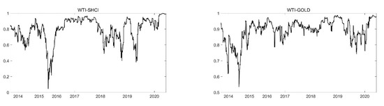 Then we can obtain the best-fitting copula function according to the AIC criterion as shown in Table 5. Based on the Compared to the AIC values of the static copula with the time-varying copula, the time-varying copula model is more suitable to reveal the dependence structure. The best-fit copula and its dependence structure for WTI-SHCI and WTI-GOLD are shown in Figure 2.