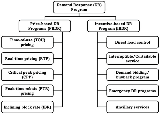 DR is divided mainly into two types of price-based demand response (PBDR) and incentive-based demand response (IBDR), as shown in Figure 1 [12]. In PBDRs, the system operator designs different tariff structures like real-time pricing (RTP), critical peak pricing (CPP), inclined block tariff (IBT), time-of-use (TOU), and peak load pricing [20]. DR is a concept in microgrids that have been widely implemented in recent studies. For example, in [21], a theoretical framework to study the joint cost and the emission pollution problem in the microgrid is addressed. The model proposed in this study consists of a tidal stream turbine (TST), photovoltaic (PV), wind turbine (WT), combined heat and power (CHP), boiler, and microturbine (MT).