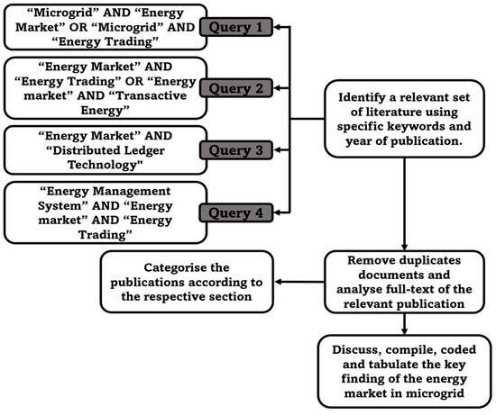 In this study, we want to present the state-of-art energy market mechanisms, methods, and designs, combined with energy trading strategies and energy management systems in the microgrid. Hence, the study provides the objective functions and constraints of which energy markets paradigm is best fitted for the end-user to maximize their profit. In this literature review paper, we followed a systematic approach to selecting papers related to the energy market in the microgrid. This section details the process used to search for relevant literature, decide which literature to include in or exclude from the review, and extract and analyze data consistently from each piece of literature. Figure 2 represents the three main stages of the review work performed in the current study.