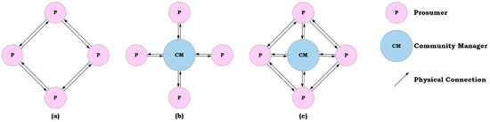 Energy trading mechanism for energy market: (a) full P2P market, (b) community-manager-based market, and (c) hybrid P2P market.
