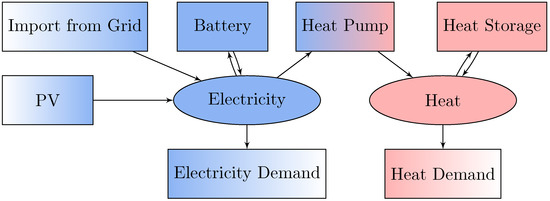 Schematic overview of exemplary energy system model of a building with photovoltaic (PV) power plant. Energy commodities are displayed as ellipses and energy conversion processes as rectangles. Arrows of a conversion process denote which energy commodities can be transformed into each other, while colors encode different types of energy. Conversion processes without input or output represent energy demands or energy imports into the model domain.